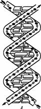 Рис. 1. Модель двойной спирали молекулы ДНК. А — участок двуспиральной молекулы ДНК; Б — схема участка деспирализованных цепей. Ясно видна комплементарность оснований, водородные связи между ними показаны точками |
