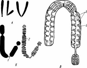 Рис. 5. Строение хромосом. Л— типы хромосом; Б, В— тонкое строение хромосом: