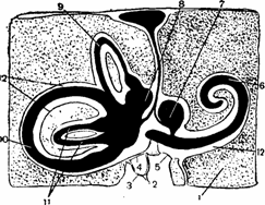 4 — окно преддверия; 5— окно улитки; 6 — улитка; 7 и 8 — отолитовый аппарат (7 — саккулус или круглый мешочек; 8 — утрикулус, или овальный мешочек); 9, 10 и 11 — полукружные каналы 12 — пространство между костным и перепончатым лабиринтами, заполненное перилимфой.