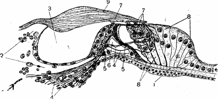 4 — нервные волокна; S — столбовые клетки, образующие тоннель (6); 7 — слуховые, или волосковые, клетки; 8 — опорные клетки; 9 — покровная пластинка.