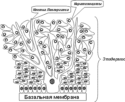 Эпидермис — это верхний, постоянно обновляющийся слой кожи, состоит из 5 слоев клеток, отличающихся, количеством и формой, а так же функциональной характеристикой. С дермой его связывает особая структура — базальная мембрана, на которой располагается однорядный базальный (зародышевый) слой призматических цилиндрических клеток которые непрестанно делятся, обеспечивая обновление кожи. Базальная мембрана образуется за счет корнеподобных отростков нижней поверхности этих клеток. Это очень важное образование. Она служит фильтром, который не пропускает крупные заряженные молекулы, а также выполняет роль связующей среды между дермой и эпидермисом. Зона базальной мембраны при световой микроскопии и окраске гематоксилин-эозином в норме не видна; при окраске по Шиффу она выявляется в виде гомогенной ленты толщиной 0,5-1,0 мкм. Ультраструктурные и иммунологические исследования позволили установить, что ЗБМ представляет собой сложную структуру, предназначенную для соединения базального слоя с дермой. Верхняя часть ЗБМ состоит из цитоплазматических тонофиламентов базальных клеток, которые соединяются с полудесмосомами. Полудесмосомы связаны с lamina lucida и lamina densa якорными филаментами. Нижняя часть ЗБМ соединена с дермой якорными филаментами, проходящими через ее коллагеновые волокна. Значение этих структур в поддержании целостности кожи продемонстрировано при буллезном эпидермолизе — наследственном заболевании, при котором они не образуются или исчезают.