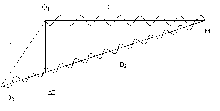 В любой точке М на поверхности воды будут складываться колебания, вызванные двумя волнами (от источников O1 и О2). Амплитуды колебаний вызванных в т.М будут отличаться друг от друга, так как волны проходят различные пути D1 и D2 .