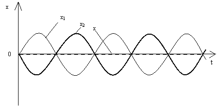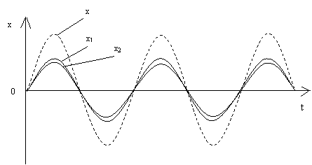 Зависимость от времени смещения х1 и х2 вызванных двумя волнами при DD=l. Разность фаз колебаний равна нулю, так как период синуса равен 2p (рис.2).