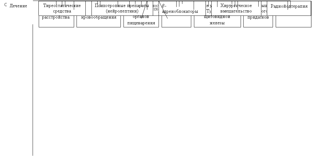 Мерказолил, препа-раты йода, b-адрено-блокаторы, тиреоид-эктомия, радиоак-тивный йод |