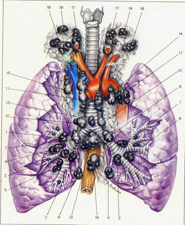 Внутрилегочные: 1 — верхнедолевые; 2 — среднедолевые; 3 — нижнедолевые; 4 — верхние междолевые правые; 5 — нижние междолевые правые: 6 — междолевые левые. Корневые: 7 — правые: 8 — левые; 9 — легочных связок. Медиастинальные: 10 — трахеобронхиальные; 11 — паратрахеальные; 12 — бифуркационные; 13 — претрахеальные; 14 — преаортокаротидные: 15 — превенозные; 16 — околопищеводные. Надключичные: 17 — глубокие яремные (нижние, средние, верхние); 18 — по ходу поперечной артерии шеи; 19 — по ходу добавочного нерва.