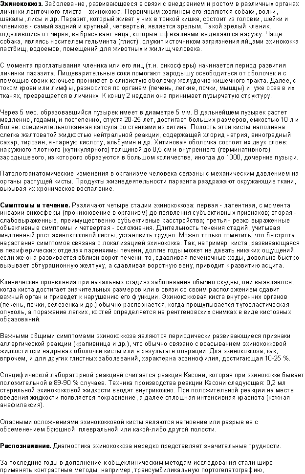 При этом следует подчеркнуть, что среди клинических симптомов одним из наиболее ранних может быть крапивница, возникающая на коже в проекции расположения паразита. Вместе с тем она нередко сопровождает разрыв пли надрыв оболочек кисты в связи с попаданием ее содержимого в окружающие ткани пли полости (грудную, брюшную).