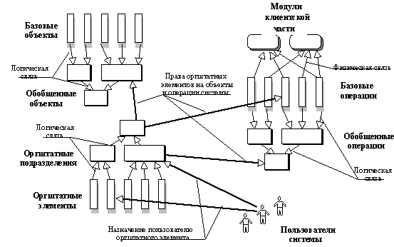 Функциональность системы основана на базовых операциях. Предоставляя пользователю набор базовых операций, администратор системы определяет тем самым его доступ. Базовые объекты определяют объектно-ориентированный взгляд на систему. Появляется возможность управлять доступом к объектам, определяя права на их методы, которыми являются элементарные операции. Каждая базовая операция использует какой-либо из методов базового объекта (т.е. какие-либо элементарные операции). Таким образом, доступ пользователя в системе складывается из его прав на базовые операции и объекты.