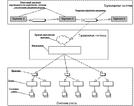Любая операция по обработке документов начинается с ввода документа в систему. Затем компонента обеспечения документооборота прикладной системы выполняет перемещение документа из одной картотеки в другую, одновременно с этим документом совершаются определенные операции. Когда в составе этих операций есть учетные, система обращается к транзитной системе, которая, в свою очередь, формирует запрос к учетной системе для формирования проводок и изменения состояния конто.