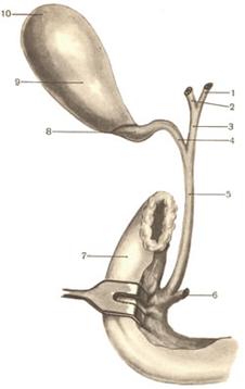 1 — ramus sinister a. hepaticae propriae; 2 — ramus dexter a. hepaticae propriae; 3 — a. gastrica dextra; 4 — a. hepatica propria; 5 — a. hepatica communis; 6 — a. gastroduodenalis; 7 — a. cystica; 8 — a. pancreaticoduodenalis superior posterior.