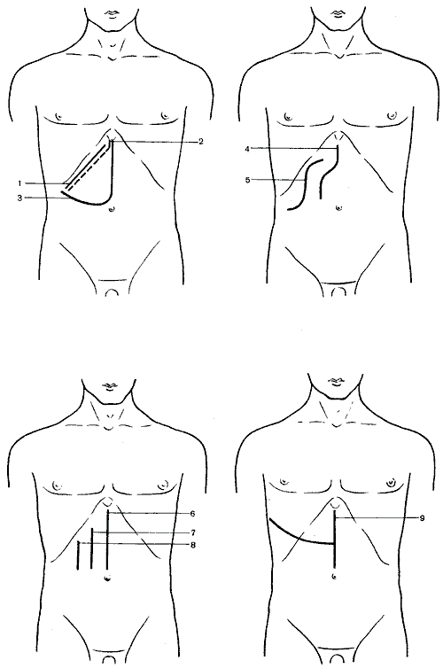 1 — косой разрез (Кохер); 2 — косой разрез (С. П. Федоров); 3 — углообразный разрез (Рио-Бранко); 4 — волнообразный разрез (Кер); 5 — волнообразный разрез (Бивен); 6 — верхний срединный разрез; 7 — трансректальный разрез; 8 — параректальный разрез; 9 — торакоабдоминальный разрез (Райфершайд); 10 — торакоабдоминальный разрез (Ф. Г. Углов); 11 — торакоабдоминальный разрез (Кунео); 12 — лоскутный разрез (Бруншвиг); 13 — углообразный разрез (Черни); 14 — торакоабдоминальный разрез (Райфершайд); 15 — торакоабдоминальный разрез (Киршнер); 16,17 — торакоабдоминальный разрез (Райфершайд).