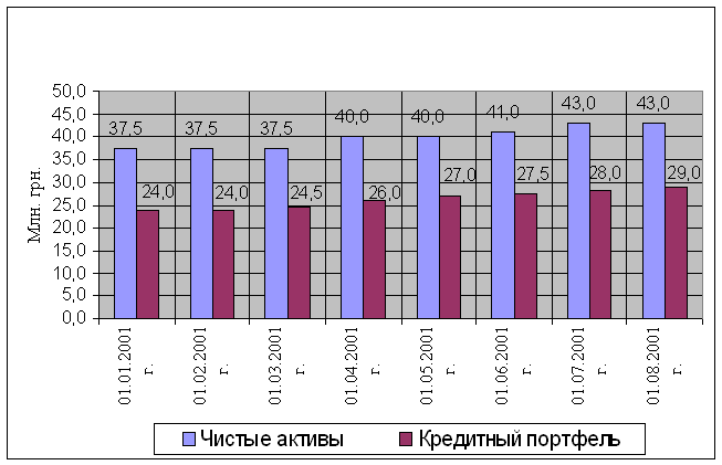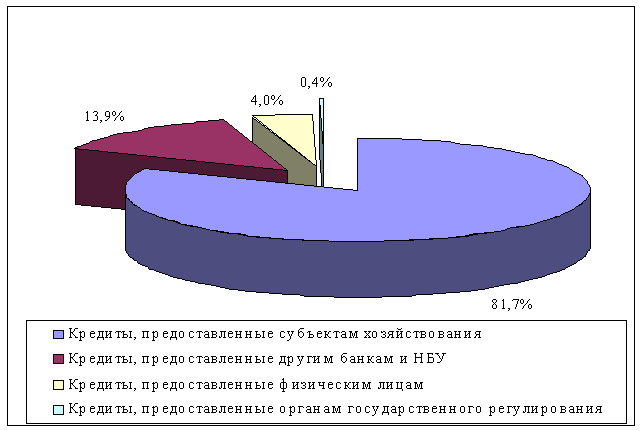 Основная часть активов банка – это кредитный портфель. В общем по системе его объем увеличился с начало 2001 года на 4 944, 3 млн. грн. или на 20,9% и на 01.07.2001 года равнялся 28 627,1 млн. грн. Увеличение произошло в основном за счет увеличения (на 28,2%) объемов кредитов, предоставленных субъектам хозяйствования. Высокими темпами (за полгода – 20,2%) увеличились и объемы кредитов, предоставленных физическим лицам.
