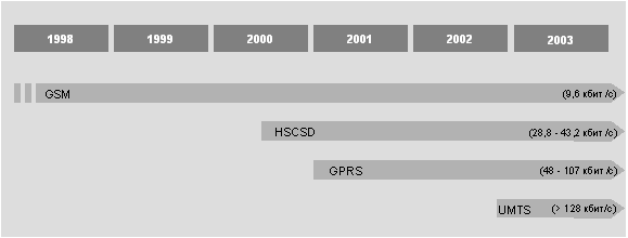 Рисунок 2: Развитие протоколов мобильной передачи данных в Германии в 1998-2003 годах с указанием скорости передачи данных