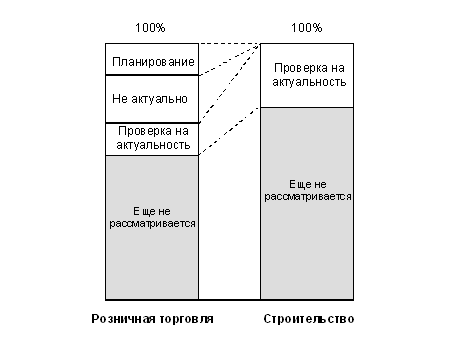 В строительной отрасли трое из четырех опрошенных предприятий еще не рассматривали вопрос о мобильной коммерции, хотя строительный сектор представляет крупнейшую отрасль германской экономики и отличается широким применением мобильной связи. Использование мобильной коммерции на определенных этапах цепочки создания стоимости могло бы способствовать значительному росту оборота.