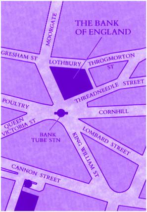 В 1734 Банк переехал в специально для него построенное здание на Threadneedle Street в центре лондонского Сити. Позже по имени этой улицы он получил свое прозвище: Old Lady of Threadneedle Street. С момента создания Банк концентрировался на выпуске векселей на принятые депозиты, т.е. предшественников сегодняшних банкнот. Он также являлся банкиром Правительства и министерств, одновременно являясь менеджером и регистродержателем по государственным ценным бумагам. Развитие Банка привело к увеличению площади здания до сегодняшних 3 акров к 1828.