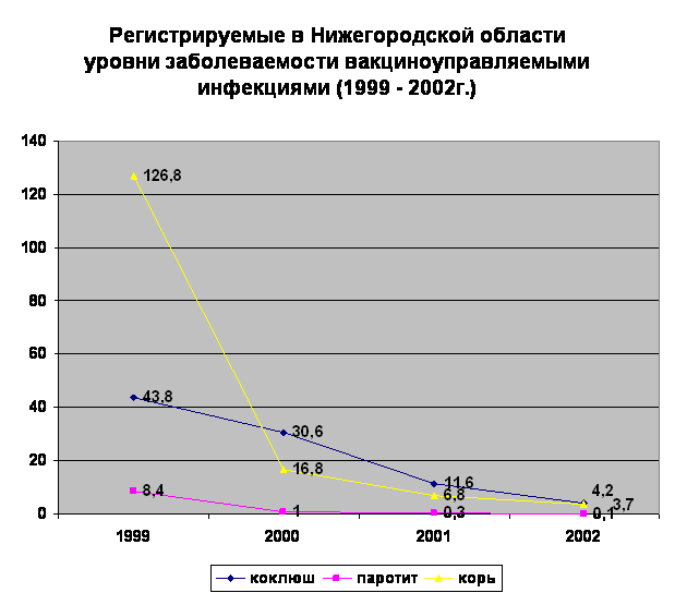 Наиболее позитивные результаты достигнуты по инфекционным заболеваниям, управляемым средствами специфической профилактики. Регистрируемые в Нижегородской области уровни заболеваемости вакциноуправляемыми инфекциями в 2 раза ниже показателей по РФ. (диаграмма №6).