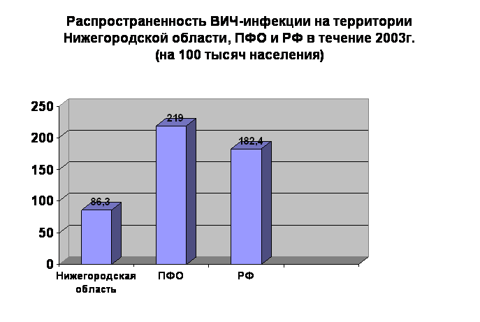 В 2003 г. в Нижегородской области отмечена стабилизация эпидемиологической ситуации по ВИЧ-инфекции. Заболеваемость по сравнению с 2002 г. снизилась в 1,6 раза и составила 13,1 на 100 тыс. населения. В Постановлении Главного Государственного санитарного врача РФ от 14.01.2004 отмечено, что Нижегородская область вошла в число пяти областей России, где зафиксированы лучшие результаты по сдерживанию темпов развития эпидемии ВИЧ-инфекции. Достичь этого удалось в результате планомерной целенаправленной работы в рамках областной целевой программы по предупреждению распространения заболевания, вызываемого вирусом иммунодефицита человека (программа АНТИ-ВИЧ/СПИД).