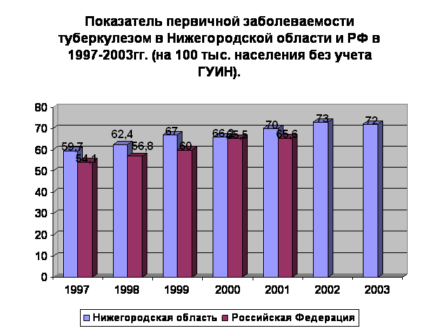 В 2003 г. произошло незначительное снижение показателя первичной заболеваемости туберкулезом населения области с 73,0 до 72,0 на 100 тысяч. Однако тревожным является факт резкого роста заболеваемости туберкулезом детей с 17,0 до 23,0 на 100 тысяч детского населения, а также рост показателя смертности от туберкулеза с 16,5 до 17,5 на 100 тысяч. В этой связи снижение показателя заболеваемости свидетельствует о недостатках диагностики и росте скрытой заболеваемости туберкулезом. Об этом же свидетельствует и рост тяжелых клинических случаев у впервые выявленных больных.