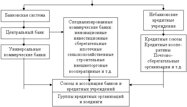 Структура кредитной системы делится на две разновидности кредитно-финансовых учреждений, которые также могут быть представлены как некоторые самостоятельные системы: банковская и небанковские кредитные учреждения.