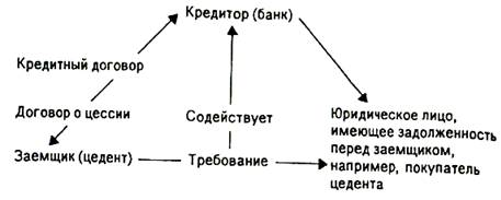 Из рис.2 видно, что договор о цессии дополняет кредитный договор, создавая правовую основу для обеспечения возвратности полученной клиентом банка ссуды. Договор о цессии предусматривает переход к банку права получения денежных средств по уступленному требованию. Стоимость уступленного требования должна быть достаточной, чтобы погасить ссудную задолженность. Банк имеет право воспользоваться поступившей выручкой только для погашения выданного кредита и платы за него. Если по уступленному требованию поступает сумма денежных средств, превышающая задолженность по ссуде, то разница возвращается цеденту. [1]