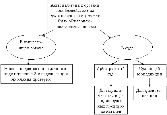 Акт проверки передается налогоплательщику или его представителю. Налогоплательщик может представить свои возражения, которые должны быть обоснованы и документально подтверждены. Причем обжалование действий налоговых органов может осуществляться в вышестоящем налоговом органе и/или в суде (см. рис. 2.1.).