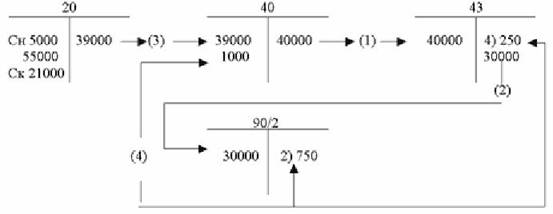 1. Дебет 43 Кредит 40 — 40 000 руб. — оприходована готовая продукция, поступившая из производства по плановой себестоимости;