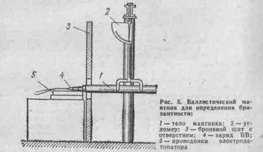 Хорошие результаты оценки бризантного действия можно получить измерением импульса ударной волны на специальном баллистическом маятнике (рис. 5). В этом случае диаметр и массу заряда можно увеличить в несколько раз, чтобы обеспечить необходимые условия полной детонации с максимальной скоростью зарядов любых ВВ, в том числе и малочувствительных. Необходимым условием проведения испытания должно быть плотное прижатие торца цилиндрического заряда к носку маятника со стальным диском, предохраняющим носок от нежелательной деформации. Чтобы боковой разлет продуктов детонации не сказывался на отклонении маятника, между зарядом и телом маятника предусмотрен броневой щит.