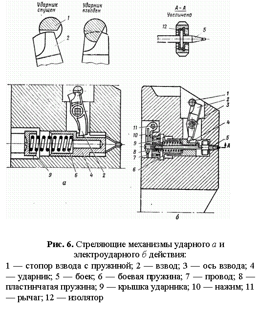 Стреляющий механизм ударного действия (рис. 6, а) (ударный механизм) обеспечивает производство выстрела ударом бойка. Для обеспечения электрического действия в стреляющем механизме (рис. 6, б) боек 5 изготовлен отдельно от ударника 4 и изолирован. Напряжение от бортсети танка подается через замкнутую кнопку стрельбы по системе контактов к проводу 7. Далее через нажим 10 и пластинчатую пружину 8 ток поступает на боек 5, а через него—на капсюльную втулку.