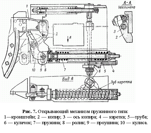 Открывающий механизм предназначен для автоматического открывания затвора после выстрела. Скалка 5 установлена в отверстиях линейки 6. Эти детали перемещаются вместе с казенником. На оси люльки сидит собачка 3 с роликом 2 и поджимом 1 (на рис. 7 положение собачки показано при накате).