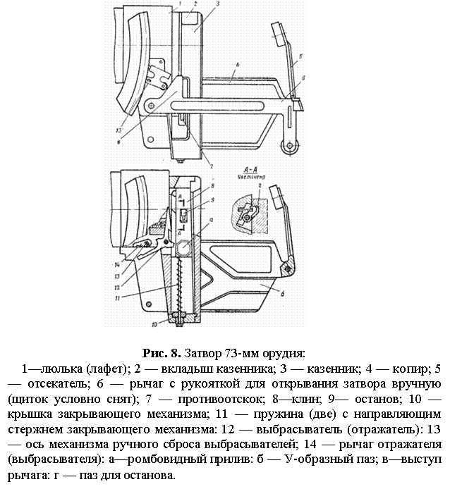 Полуавтоматика (рис. 8) затвора 73-мм орудия состоит из открывающего механизма копирного типа и закрывающего механизма. Открывающий механизм состоит из двух прикрепленных к люльке (лафету) 1 копиров 4.