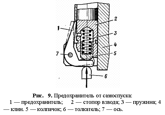 Предохранитель 1 (рис. 9) от самоспуска имеет вид двуплечего рычага, посаженного на нижний конец стопора 2 взвода на оси 7. Верхний конец его поджимается к стопору 2 с помощью поджима (колпачка 5 и пружины 3).