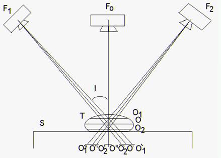 F0,F1,F2-нулевое,исходное и конечное положение фокуса рентгеновской трубки; j-1/2 угла поворота трубки; S-поверхность стола; Т-объект исследования; О-точка выделяемого слоя; О1, О2-точки, находящиеся выше и ниже выделяемого слоя; О`, О``-проекции точки О на пленке при исходном и конечном положениях фокуса рентгеновской трубки; О1`, O1``-проекции точки О1 на пленке при тех же положениях фокуса трубки; О2`, О2``-проекции точки О2 при тех же положениях фокуса трубки; О```-проекции всех точек на пленке при нулевом положении рентгеновской трубки.