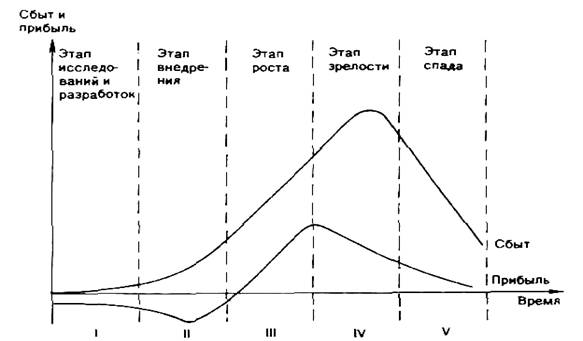 На рисунке показаны разные периоды жизни продукта с учетом зависимости сбыта и прибыли от возраста продукта.