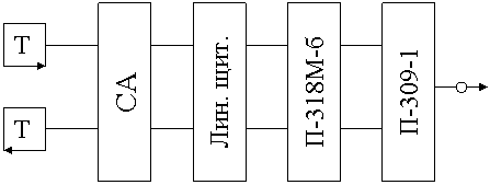 Рис. 3 Для получения 10,12,16 телеграфных каналов в одном телефонном канале упаковки П-318М-6 и П-318М-4 соединяются в рабочий комплект в соответствующем количестве. Кроме того, при образовании 10,6 и 4-х телеграфных каналов, есть возможность образовать телефонную служебную связь в спектре частот 300-1300Гц. Рис. 4 Входы и выходытелеграфных каналов аппаратуры П-318М-6, П-318М-4 двухполюсные. Рис. 5 Переходное устройство П-318М-ПУ предназначено для согласования двухполюсных входов и выходов аппаратуры тонального телеграфирования с оконечными аппаратами, работающими током одного направления. |