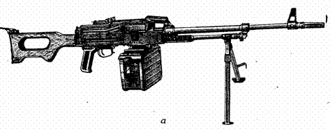 Пулеметы ПК и ПКМ (рис. 1,а) имеют сошку; пулемет ПКС (рис. 1,6) —это пулемет ПК, установленный на треножный станок конструкции Саможенкова, а пулемет ПКМС—это пулемет ПКМ, установленный на треножный станок конструкции Степанова; пулеметы ПКБ и ПКМБ —это соответственно пулеметы ПК и ПКМ, размещенные на бронетранспортерной установке машины; пулемет ПКТ— это пулемет Калашникова с электроспуском (рис. 1,е), размещенный в танке (боевой машине пехоты, бронетранспортере, самоходной артиллерийской установке или другой машине).