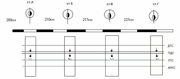 Схема связи ж/д. участка представлена ниже, где ДТС - дорожная телефонная связь (цветная цепь), ПДС – поездная диспетчерская связь (стальная цепь), ПТС – подстанционная телефонная связь (стальная цепь), МЖС – межстанционная связь (стальная цепь).