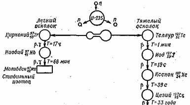 Рис 1. Пример радиоактивных превращений двух осколков деления ядра урана-235