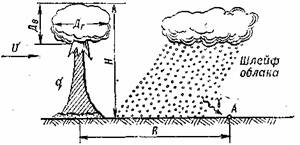 Л — активность; Н — высота подъема верхней кромки облака; Дв— вертикальный размер облака; Дг - горизонтальный диаметр облака: q — мощность взрыва; V — скорость среднего ветра; R— расстояние от центра взрыва