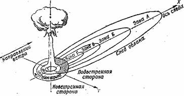 Рис. 3. Схема радиоактивного заражения местности в районе взрыва и по следу движения облака