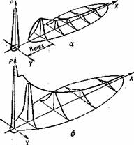 Рис. 4. Схема распределения уровней радиации на время образования радиоактивного заражения в сечениях: а — по следу низкого воздушного ядерного взрыва, б — по следу наземного ядерного взрыва |