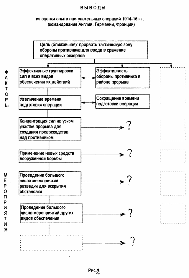 Важный вывод анализа истории военного искусства: пассивные действия гибельны для слабой обороняющейся стороны; условия обстановки типичны для применения обороняющейся стороной принципа Суворова - Брусилова распределения сил и средств.[6]