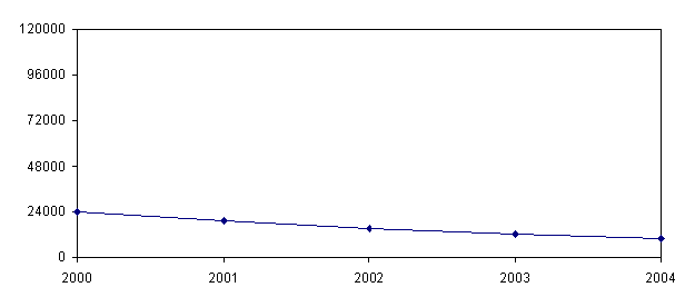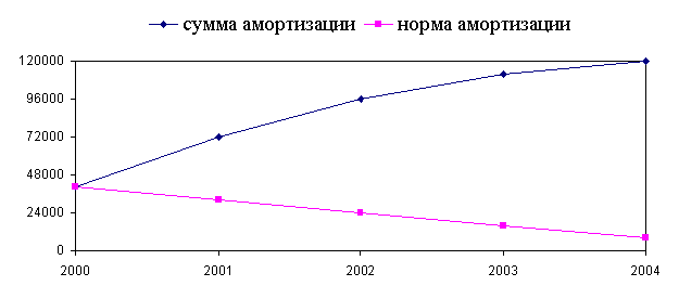 Из рис.3 видно, что самые большие отчисления приходятся на первые годы эксплуатации объекта основных средств. В последующие годы сумма амортизационных отчислений довольно резко падает. Применение этого способа может оказаться полезным 000 "Олегро -Ф", так как у организации на балансе небольшое количество основных средств. Это позволит им минимизировать налоги, что немаловажно, но и за счет высвобождаемых средств приобрести необходимое количество основных средств. К тому же, 000 "Олегро-Ф" впускает дверные блоки и товары народного потребления, пользующиеся спросом, поэтому можно предположить, что и цена их допускает дополнительное включение в виде амортизаци5онных отчислений.