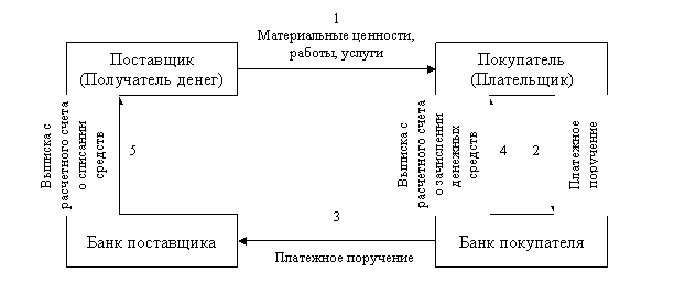 3. Банк покупателя списывает с расчетного счета покупателя сумму денежных средств, указанную в платежном поручении, и направляет платежное поручение банку поставщика для зачисления этой суммы на счет получателя.