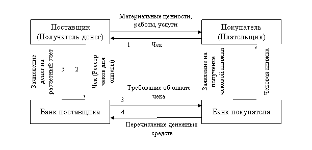 Организация-плательщик для оплаты за полученные материальные ценности, выполненные работы, оказанные ему услуги выдает чек предприятию, от которого эти ценности, работы или услуги получены. Но чек — это денежный документ, по которому деньги еще надо получить. Для этого организация, получившая чек (чекодержатель), предъявляет его в свое учреждение банка, а тот, в свою очередь, предъявляет требование об оплате чека банку, обслуживающему чекодателя.