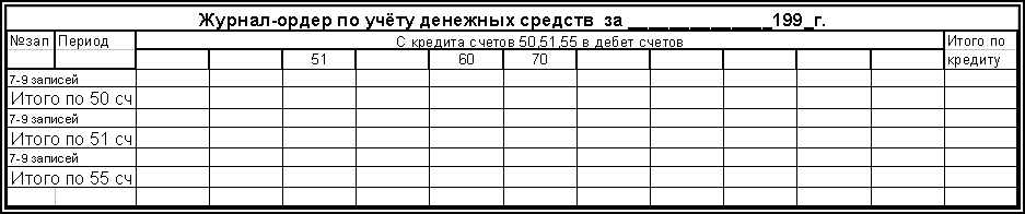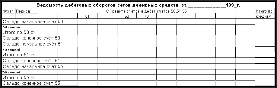 Следующее предложение также вытекает из объёма работ, выполняемых в настоящее время в бухгалтерии предприятия по учёту денежных средств–недостаток средств сказывается на количестве и объёмах их движения и соответственно объёмах учётных работ. Анализируя структуру регистров журнально-ордерной формы учёта, предназначенных для регистрации операций по денежным счетам (Ж-О №1,2,3; Ведомости №1а,2а,25-АПК), можно сделать вывод о том, что они идентичны. Таким образом, вместо заполнения трёх журналов-ордеров и трёх ведомостей становится возможным использование одного, содержащего всю информацию по наличию и движению денежных средств по предприятию на базе 1-го журнала-ордера и ведомости к нему. При этом для регистрации операций по каждому из счетов отводится 10-12 строк (всего в Ж-О №1 30 строк), что вполне достаточно при периодичности внесения учётных данных в этот регистр 3-4 дня для отражения движения в целом за месяц. Журнал-ордер и ведомость по дебетовым оборотам к нему будут выглядеть следующим образом (см рис.3.1).