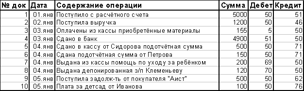 Кассир формирует файл, содержащий электронную таблицу, форма которой аналогична форме Кассовой книги и вносит в неё с клавиатуры информацию о зарегистрированных в Журнале КО-3 документах, таблица будет иметь вид, допустим, что входной остаток по кассе 500 грн :