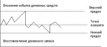 Логика действий главного бухгалтера по управлению остатком средств на расчетном счете представлена па рисунке и заключается в следующем. Остаток средств на счете хаотически меняется до тех пор, пока не достигает верхнего предела. Как только это происходит, предприятие начинает покупать достаточное количество ценных бумаг с целью вернуть запас денежных средств к некоторому нормальному уровню (точке возврата). Если запас денежных средств достигает нижнего предела, то в этом случае предприятие продает свои ценные бумаги и таким образом пополняет запас денежных средств до нормального предела.