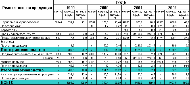 Таким образом, на основании данных о выручке в 2002 году специализацию предприятия можно определить как зерновую, однако нельзя дать гарантии, что она не изменится в будущем. Высокий уровень специализации производства характерен для стран с развитой рыночной экономикой, такая узкая направленность позволяет предприятию увеличить интенсивность и эффективность вложения средств, закрепиться на определённой рыночной нише и уверенно чувствовать себя в конкурентной борьбе. Можно сказать, что сейчас руководство находится на стадии поиска наиболее оптимальной специализации.