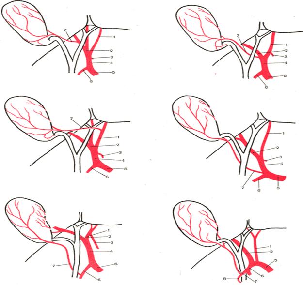 1 — ramus sinister a. hepaticae propriae; 2 — ramus dexter a. hepaticae propriae; 3 — a. gastrica dextra; 4 — a. hepatica propria; 5 — a. hepatica communis; 6 — a. gastroduodenalis; 7 — a. cystica; 8 — a. pancreaticoduodenalis superior posterior.