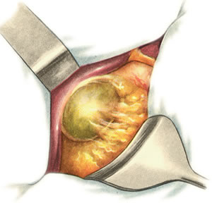После вскрытия брюшной полости рану растягивают ранорасширителем и приступают к осмотру желчного пузыря.