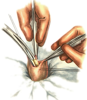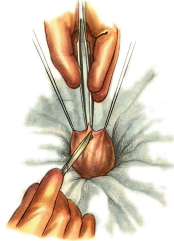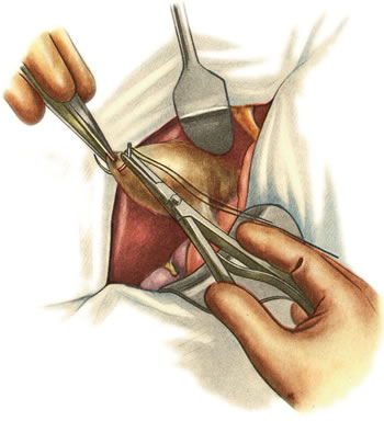 Нередко при острых и хронических воспалительных процессах в пузыре имеются сращения между пузырем и окружающими органами, поэтому удаление желчного пузыря следует начинать с разъединения сращений.